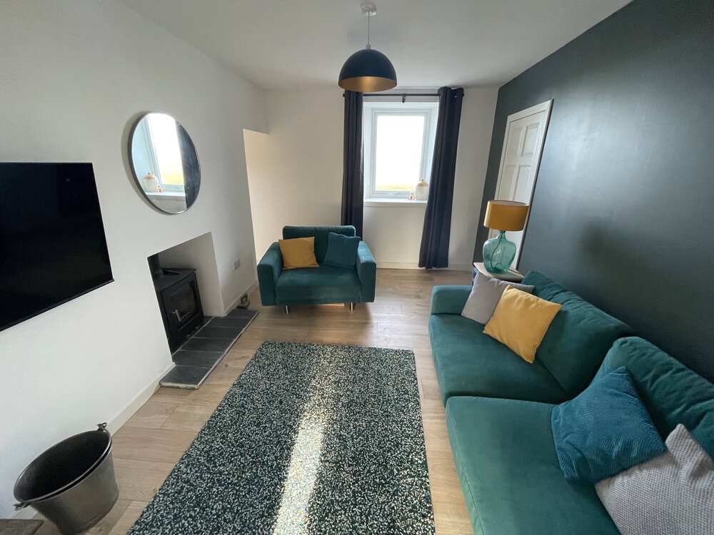 Cosy lounge with log burner.